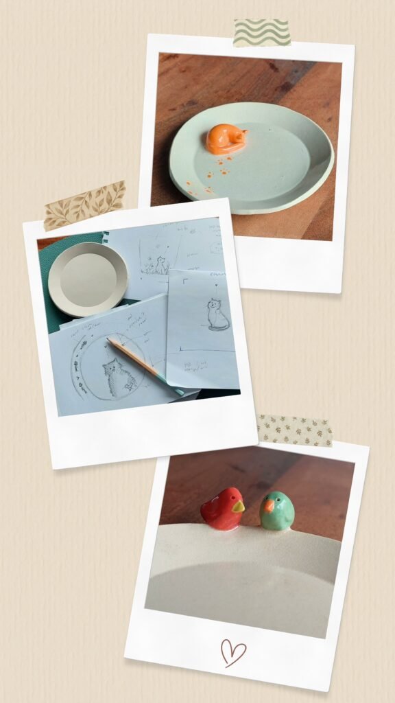 Het is fascinerend om te zien hoe een schets uit mijn schetsboek langzaam transformeert tot een tastbaar object. Waar ik op papier met fijne lijnen werk, dwingt de klei me om op een andere manier naar vorm en balans te kijken. Het vormen van de klei is een heerlijke, tastbare afwisseling op het gedetailleerde tekenwerk. Illustraties op keramiek brengen deze twee werelden mooi samen!